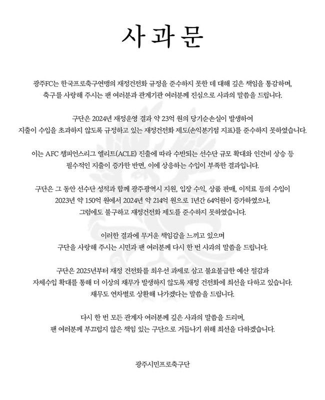 광주는 지난달 말 재정 건전화 규정 미준수에 대해 사과했다. 광주는 2024년 재정 운영 결과 약 23억 원의 당기순손실이 발생하여 재정 건전화 제도를 준수하지 못했다. 아시아축구연맹(AFC) 챔피언스리그 엘리트(ACLE) 진출에 따라 수반되는 선수단 규모 확대, 인건비 상승 등 필수적인 지출이 증가했지만 수입이 부족했기에 발생한 결과라고 밝혔다. 광주는 2024년 수입이 약 214억 원으로 1년 동안 64억 원이 증가했음에도 재정 건전화 제도를 준수하지 못했다고 이야기했다.
