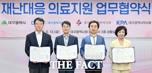 [더팩트┃대구=박병선 기자] 대구시는 13일 동인청사에서 대구시의사회, 대구시한의사회, 대구시약사회와 함께 전국 최초로 '재난 대응 의료지원을 위한 업무협약'을 체결했다.
