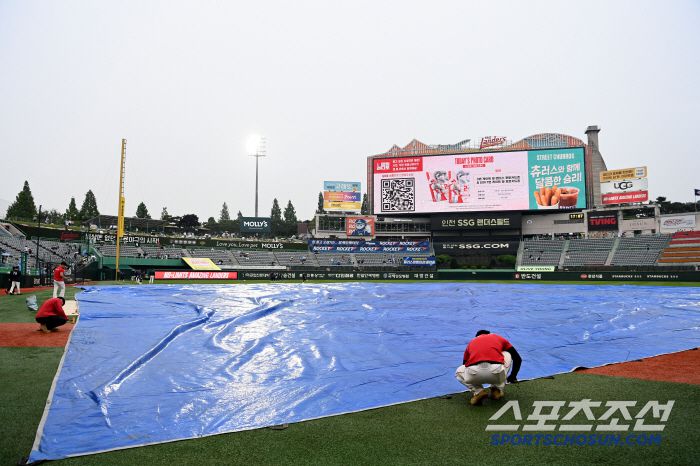 13일 인천SSG랜더스필드에서 롯데와 SSG의 경기가 예정된 가운데 그라운드에 비가 내려 방수포가 설치되고 있다. 인천=허상욱 기자wook@sportschosun.com/2025.06.13/