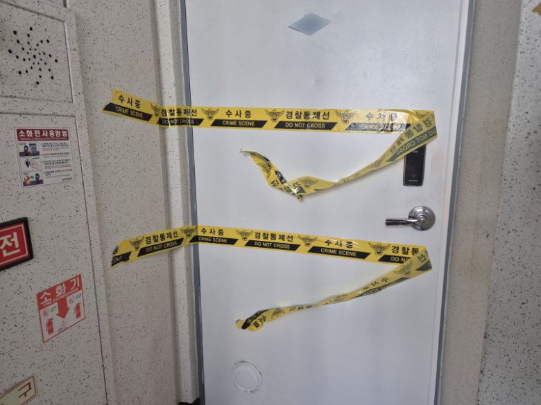 50대 여성이 흉기에 찔려 숨진 대구 달서구의 아파트 입구에 경찰 폴리스라인이 설치됐다.(독자 제공.재판매 및 DB 금지) /사진=뉴스1