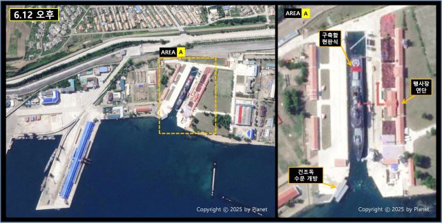 북한이 지난달 21일 진수식 도중 넘어진 신형 구축함을 수리해 진수식을 개최했다.