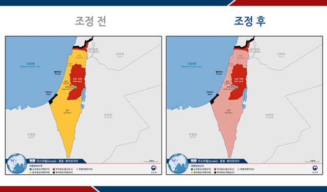 기존에 발령된 이스라엘 일부 지역에 대한 여행경보 3단계(출국권고)와 4단계(여행금지) 및 이란 일부 지역에 대한 여행경보 3단계는 그대로 유지된다.