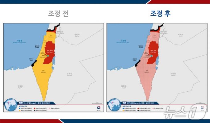이스라엘 여행경보 조정전후 지도. (외교부 제공) |