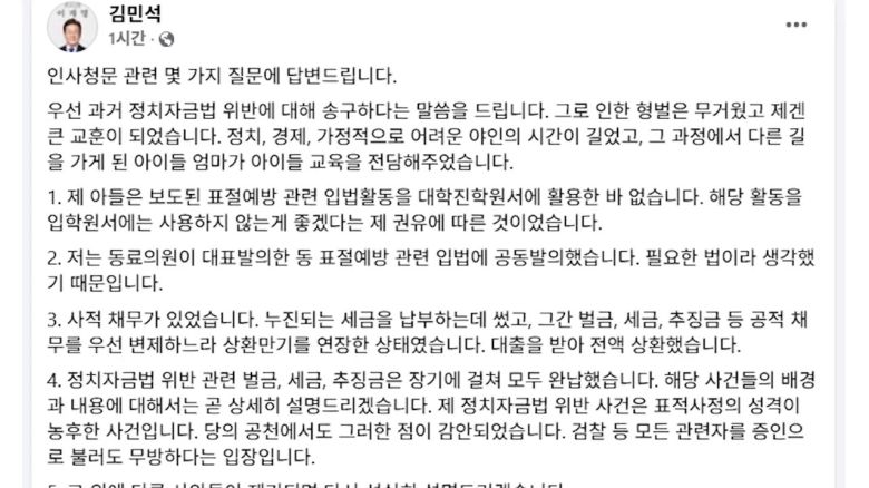 김민석 국무총리 후보자가 오늘(13일) 자신의 SNS를 통해 최근 불거진 각종 논란에 대해 직접 해명했습니다.