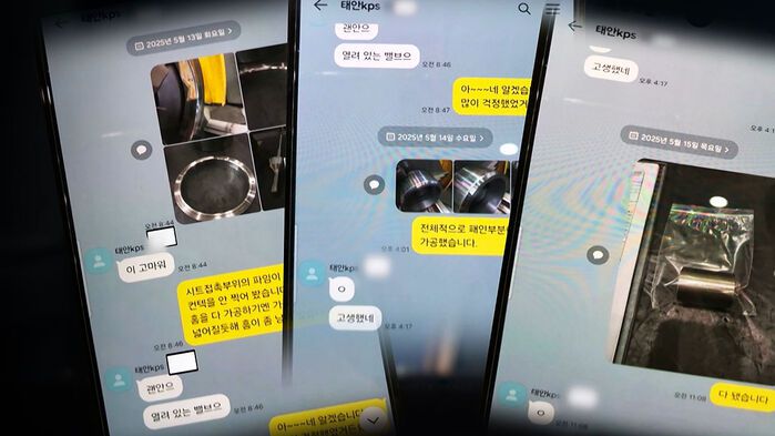 김 씨가 밸브 표면을 다듬는 작업이 끝났다며 사진을 보내자, 원청업체인 한전KPS 직원이 "애썼다"고 답장을 보냈습니다.