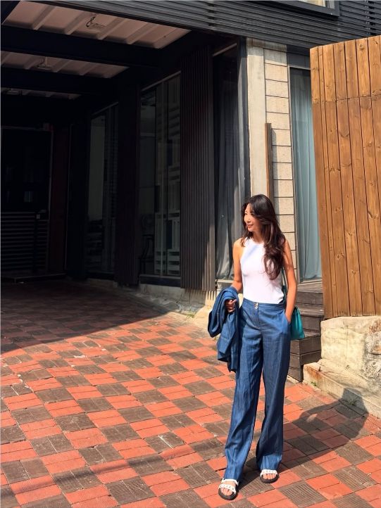 사진 속 전미라는 블루 계열의 데님 셋업에 슬리브리스 톱을 매치하고, 포인트 컬러의 가방으로 트렌디한 감각을 드러냈다.