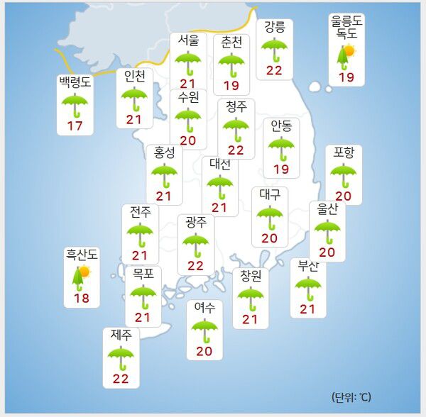 주요 도시별, 지역별 아침 최저기온은 △서울 21도 △인천 21도 △춘천 19도 △강릉 22도 △대전 21도 △대구 20도 △전주 21도 △광주 22도 △부산 21도 △제주 22도 △울릉도 독도 19도다.