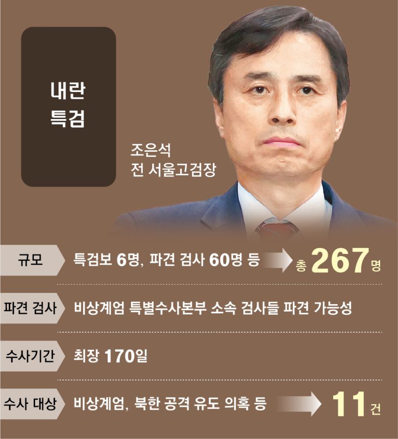 조 특검이 검사 시절 ‘특수통’으로 분류됐던 만큼 조 특검과 함께 수사했던 특수통 검사들의 합류도 예상된다. 다만 조 특검이 이른바 ‘친윤(친윤석열계)’ 검사나 특수통 검사들에 대한 여권의 거부감을 감안할 경우 수사팀 구성에 상당한 시간이 걸릴 거란 분석도 있다. 이들을 제외하다 보면 수사를 잘할 인력들을 확보하기가 쉽지 않을 수 있어서다. 이 때문에 특수통보다는 ‘공안통’ 검사들이 대거 차출될 거란 관측도 제기된다. 내란 특검의 수사 대상에 북한의 공격을 유도했다는 외환죄 의혹까지 포함돼 있기 때문이다. 특검법상 공수처 인력을 3명 이상 투입하게 돼 있는 만큼 공수처 비상계엄 태스크포스(TF) 인력도 파견 갈 것으로 보인다.