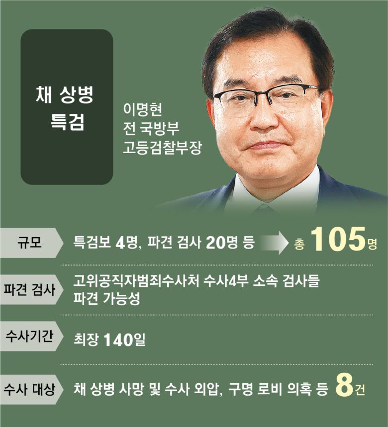 이 특검도 수사팀 구성에 속도를 내고 있다. 이 특검은 이날 기자들과 만나 특검보 인선에 대해 “박정훈 대령의 변호인들, 김정민 변호사나 김경민 변호사 이런 변호사 분들은 옛날에 같이 근무한 후배들”이라면서 “그분들이 저한테 자문을 구해서 내용에 대해 어느 정도 알고 있다. 그분들이 선발되면 더 좋겠다”고 말했다. 이 특검은 채 상병 사건 외압 의혹을 1년 10개월 간 수사해온 공수처를 중심으로 수사 인력을 파견받을 것으로 보인다. 이에 공수처는 채 상병 사건 수사를 전담해 온 수사4부(부장검사 차정현) 인력을 그대로 파견 보내는 방안을 검토하는 것으로 알려졌다.