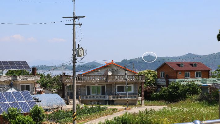 북한이 우리 군의 대북 확성기 방송 중지에 호응해 대남 소음 방송을 멈춘 것으로 추측되는 가운데 12일 인천 강화군 송해면 당산리 마을에서 바라본 북한 지역 야산에 대남 방송 스피커(흰색 원 안)가 보이고 있다. 연합뉴스