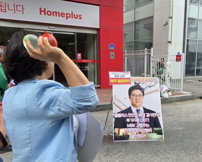 마트 노동자들이 지난 2일 천안시 동남구 홈플러스 천안점 앞에서 열린 폐점 반대 기자회견에서 김병주 MBK파트너스 회장을 규탄하며 얼굴 사진에 물풍선을 던지고 있다. /사진=뉴스1