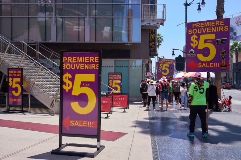 지난달 30일(현지시간) 미국 캘리포니아주 로스앤젤레스(LA) 할리우드 지역에서 사람들이 5달러짜리 기념품 표지판 옆을 지나가고 있다. [EPA]