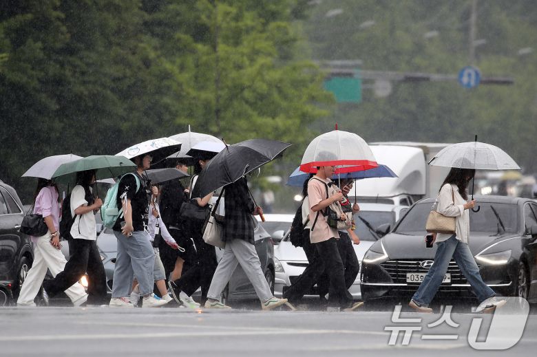 13일 오후 대구 달서구 계명대 성서캠퍼스 앞 도로에서 장맛비를 피해 우산을 쓴 시민들이 발걸음을 재촉하고 있다. 2025.6.13/뉴스1 ⓒ News1 공정식 기자 |