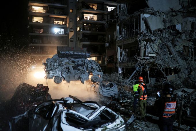 13일(현지시간) 이스라엘 구조인력이 이란의 보복 공습 현장에서 구조활동 중인 모습./로이터=뉴스1 |