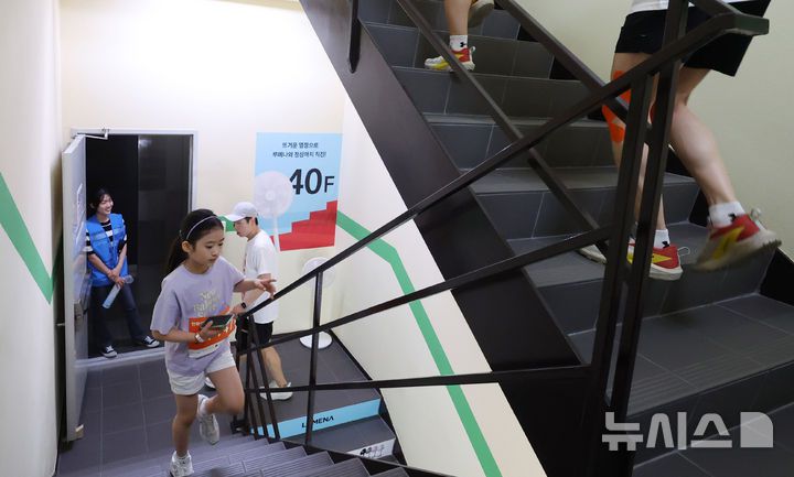 [서울=뉴시스] 추상철 기자 = 14일 오전 서울 영등포구 여의도 63빌딩에서 열린 '한화생명 시그니처 63 RUN' 행사에서 참가자가 40층을 지나며 쉬고 있다. 2025.06.14. scchoo@newsis.com