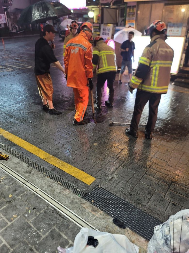 14일 오전 2시 33분경 부산 연제구 연산동에 닫혀있지 않던 맨홀 구멍에 대해 소방이 안전조치를 취하고 있다. 부산소방재난본부 제공