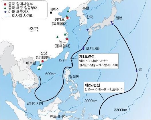 미국은 냉전 시대인 1950년대 초부터 규수·오키나와·류큐 제도 등의 일본 남부와 타이완~필리핀 북부~보르네오 북단~남중국해 북부 해역에 이르는 '자연적 장벽'인 '제1 도련선(島鏈線·Island Chain)'을 설정하고, 중국해군의 활동 반경을 제약해 왔다. 중국도 이 도련선 안에서는 해상 패권을 유지하겠다며, 미국과 다른 강대국에 대해 '접근 거부/지역 거부'(A2/AD·Anti-Access/Area Denial) 전략을 펼쳐가며 저항했다.