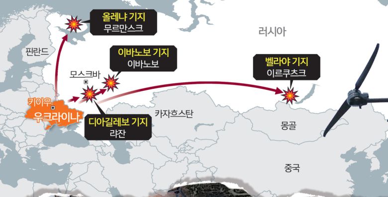 1일(현지시간) 러시아 이르쿠츠크주 벨라야 공군기지에 우크라이나 ‘거미줄 작전’으로 피격당한 러시아 전략폭격기 잔해가 남아 있다.(가운데) 오른쪽 사진은 우크라이나 1인칭시점(FPV) 드론이 러시아 영토 깊숙이 침투해 전투기를 공격하는 모습.코스티안티니우카·이르쿠츠크=APUPI연합뉴스 |