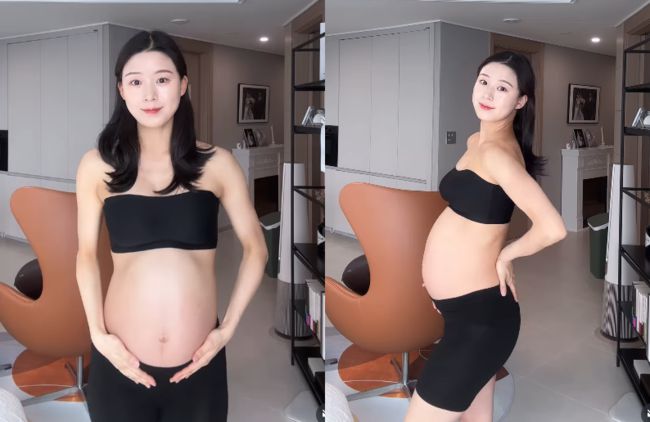 영상에는 "9개월 임산부 33주차 배크기"라며 브라톱에 레깅스를 입은 채 D라인을 뽐내고 있는 윤혜수의 모습이 담겼다. 부풀어 오른 배와는 달리 여전히 군살없이 가느다란 팔다리가 시선을 사로잡는다.