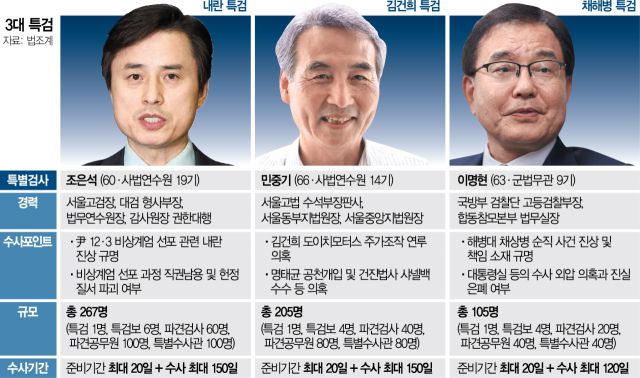 14일 법조계에 따르면 이달 12일 내란 특검으로 임명된 조은석(60·사법연수원 19기) 전 서울고검장과 김건희 여사 특검으로 임명된 민중기(66·사법연수원 14기) 전 서울중앙지방법원장, 채상병 특검으로 임명된 이명현(63·군법무관 9회) 전 국방부 고등검찰부장은 전날부터 본격적으로 수사팀 구성과 사무실 확보 작업에 돌입했다.