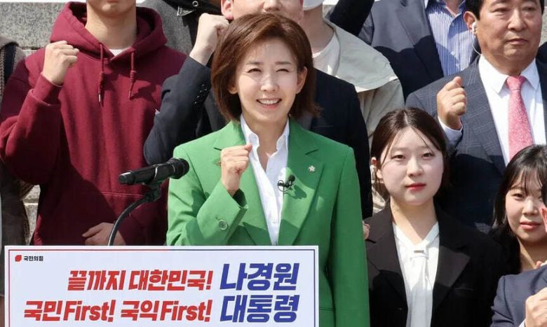 나경원 국민의힘 의원이 지난 4월11일 오후 국회 본청 앞 계단에서 대선 출마 선언을 하기 전 기념사진을 찍고 있다. 김경호 선임기자 jijae@hani.co.kr