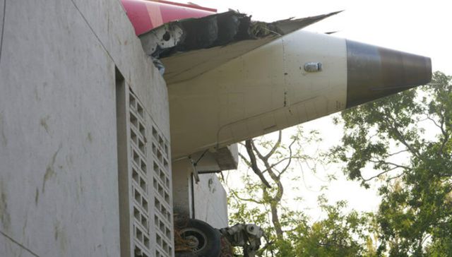12일(현지시간) 인도 구자라트주 아마다바드에서 발생한 여객기 추락 사고 현장 건물 외벽에 기체 잔해가 튀어나와 있다. /AP·뉴시스 |