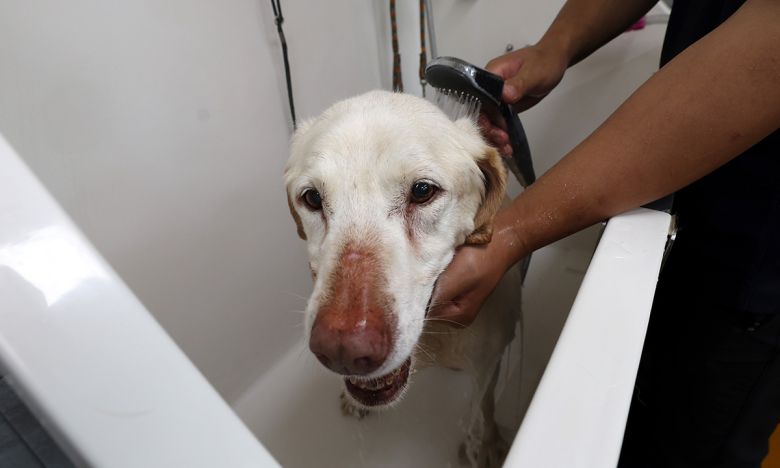 김동영 사양관리사가 벨라(2018년생, 래브라도리트리버) 목욕을 시켜주고 있다. |