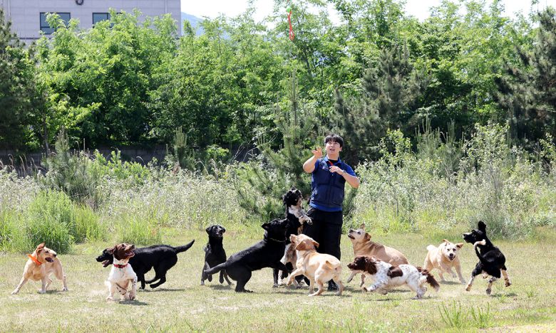영종도 관세청 탐지견훈련센터 초지훈련장에서 장정호 실무관(사양관리사)이 마약탐지견들의 스트레스 해소와 체력운동으로 공 잡기 단체놀이를 진행하고 있다. |