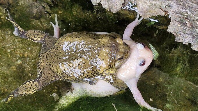 온몸이 새하얀 맹꽁이가 짝짓기하는 희귀한 장면이 대전에서 관찰됐다. 국내에서 백색증(알비노) 맹꽁이가 발견된 것은 지난 2009년에 이어 두 번째다. 맹꽁이는 환경부 지정 멸종위기 2급 양서류로, 장마철에 집단으로 모여 짝짓기를 한다.