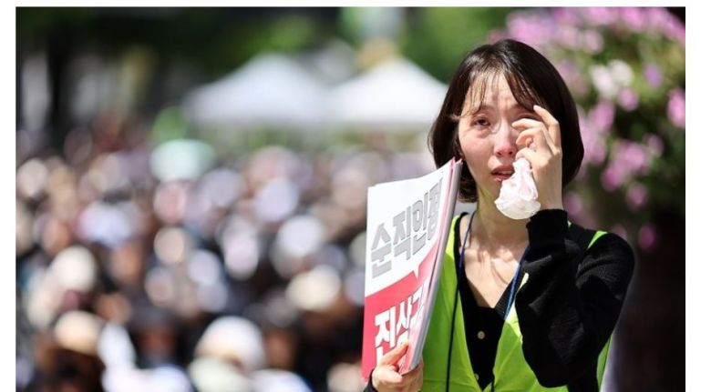 14일 정부서울청사 인근에서 열린 제주 교사 추모 및 교권 보호 대책 요구 전국 교원 집회에서 참석자들이 고인의 추모 영상을 보며 슬픔에 잠겨 있다. 연합뉴스