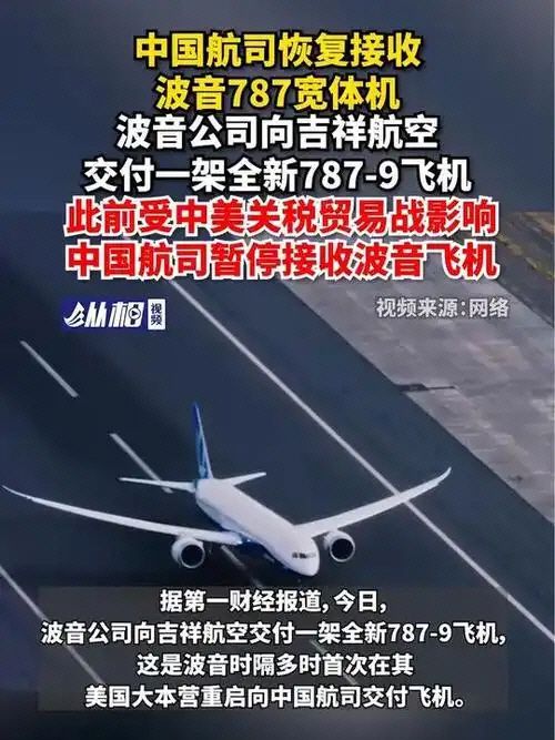 디이차이징(第一財經)을 비롯한 매체들의 13일 보도를 종합하면 보잉은 이날 중국 상하이(上海)에 본사를 둔 지샹(吉祥)항공에 보잉 787-9 광동체(wide-body aircraft ) 항공기를 인도한 것으로 알려지고 있다. 이는 미중 관세전쟁의 영향으로 중국 항공사들이 보잉 항공기 수령을 중단한 이후 보잉의 미국 본사에서 중국 항공사로 항공기가 인도된 첫 사례라고 할 수 있다.