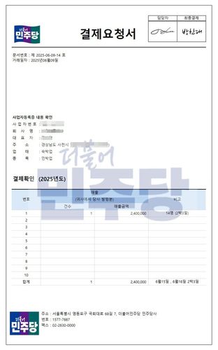 A씨가 예약금을 입금해야 방을 빼놓을 수 있다고 하자 B씨는 박찬대 당시 당 대표 직무대행 겸 원내대표 서명이 적힌 결제요청서를 A씨에게 보냈다.