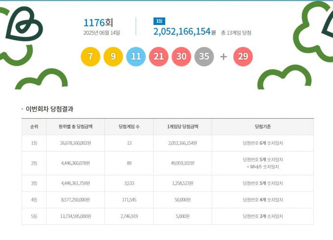 로또복권 운영사 동행복권은 제1176회 로또복권 추첨 결과, '7·9·11·21·30·35'가 1등 당첨 번호로 뽑혔다고 14일 밝혔다. 2등 보너스 번호는 '29'이다.