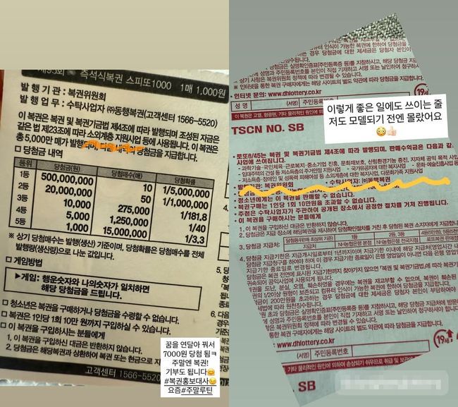 [OSEN=장우영 기자] 배우 박하선이 복권에 당첨되는 행운을 안았다. 행복감을 만끽한 박하선은 복권을 구매하면 기부도 된다는 사실을 알리면서 선한 영향력을 행사했다.