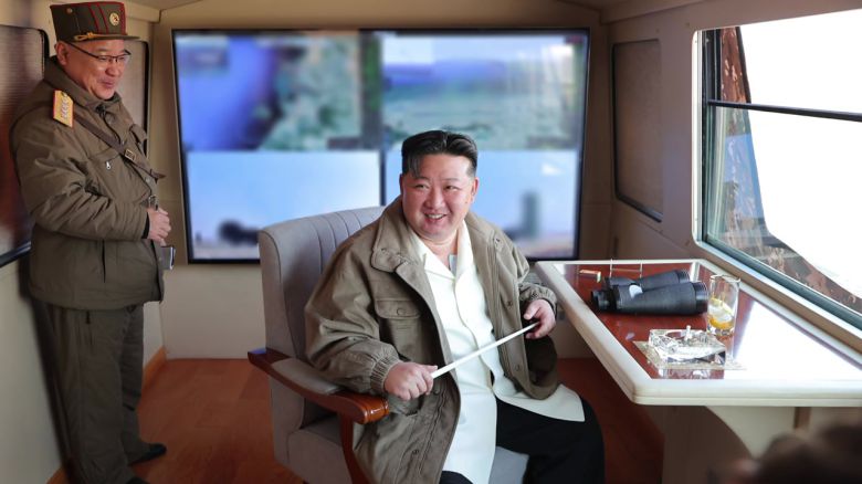 김정은 국무위원장은 모니터로 시험 결과를 보며 만족을 표시합니다.