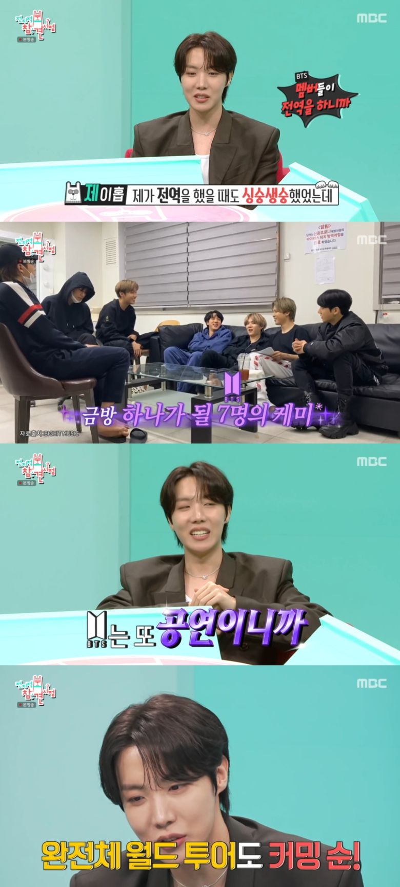 이날 제이홉은 사회복무요원으로 복무 중인 슈가를 제외한 모든 멤버들의 전역을 언급하며 “제가 돌아올 때도 싱숭생숭했는데 멤버들이 돌아오니 합이 잘 맞을까 걱정된다”라고 털어놨다.