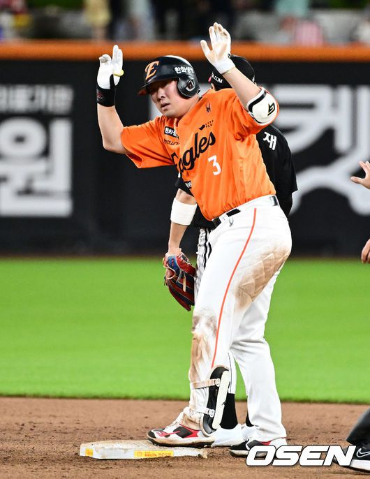 연장 11회말 2사에서 한화 안치홍이 2루타를 날리며 기뻐하고 있다. 2025.06.14 /jpnews@osen.co.kr