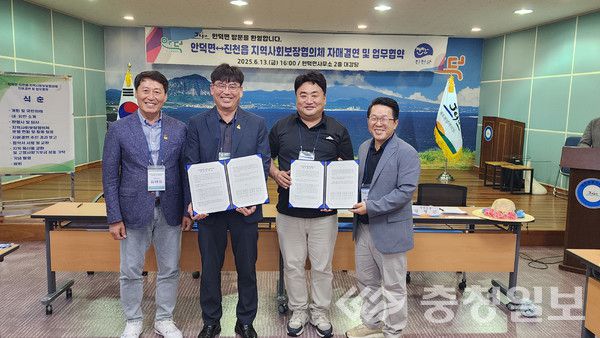 충북 진천군 진천읍 지역사회보장협의체(공공위원장 임병곤, 민간위원장 송석현)와 제주도 서귀포시 안덕면 지역사회보장협의체(공공위원장 김태유, 민간위원장 양상택)는 지난 13일 안덕면 행정복지센터에서 업무협약을 체결했다.