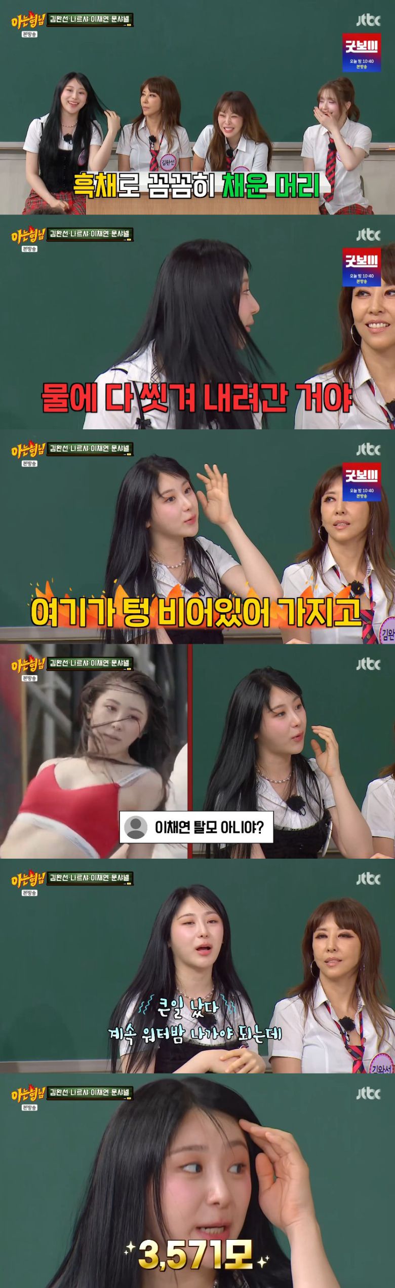 이날 멤버들이 워터밤에 좋지 않은 기억이 있는 이유를 묻자 이채연은 "첫 워터밤이었다. 이것저것 열심히 준비하다가 머리도 잘 채워야겠다, 비어 있는 공간을 잘 채워야겠다 해서 흑채를 꼼꼼히 했다"며 "진짜 물에 다 씻겨 내려갔다"고 답했다.