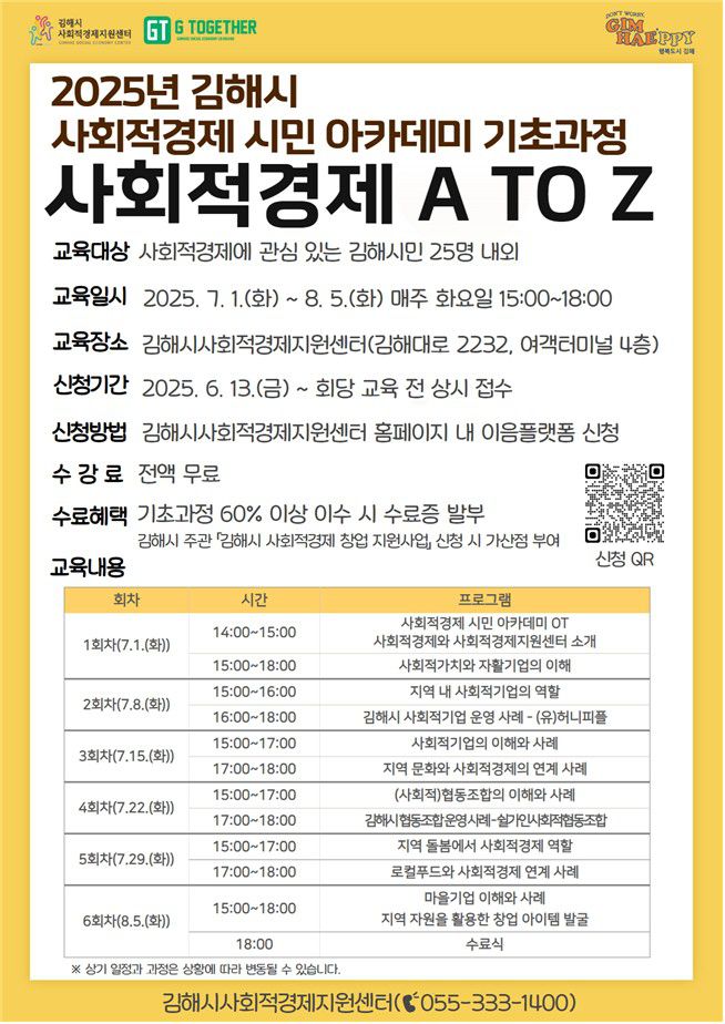 참가 자격은 김해시민이면 누구나 가능하며 교육비는 무료다. 신청은 13일부터 아카데미 기간 회차별 교육 전 상시 접수하며 김해시사회적경제지원센터 누리집 내 이음플랫폼이나 김해시사회적경제지원센터를 통해 할 수 있다.