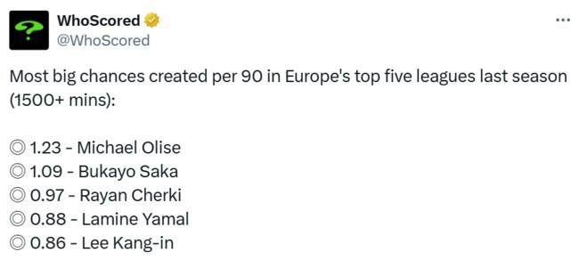 유럽 5대 리그는 프리미어리그, 라리가, 분데스리가, 세리에A, 리그앙을 말한다. 이 5개 리그 전체 선수들 중에서 90분당 기회 창출이 가장 많았던 선수는 마이클 올리세(바이에른 뮌헨)다. 90분당 1.23회로 1위였다. 그 밑으로 부카요 사카(아스널, 1.09회)가 2위였고 맨체스터 시티 이적이 확정된 라얀 셰르키(0.97회)가 그 뒤를 이었다. 4위는 바르셀로나의 초신성 라민 야말(0.88회)이었고, 5위가 파리 생제르맹(PSG)에서 뛰고 있는 이강인이었다. 이강인은 90분당 0.86회의 기회 창출을 기록했다.