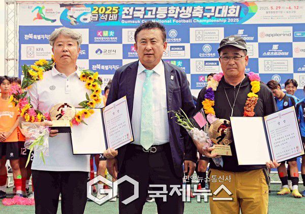 (군산=국제뉴스) 김병용 기자 = 대전 유성생명과학고 홍위표 감독과 김대수 코치가 12일 군산시 월명종합경기장에서 열린 2025 금석배 전국고등축구 U-17 유스컵 시상식에서 서상일 전북축구협회장으로부터 최우수지도자상 수상의 영광을 안았다.