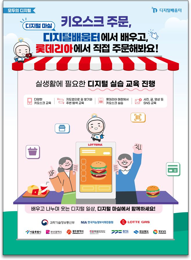교육은 ‘디지털 배움터 사업’ 수행기관인 (주)SLI평생교육원이 수행 예정으로, 2025년 6월부터 11월까지 운영되며, ① 디지털배움터(복지관, 경로당 등)에서 무인 주문기(키오스크) 이용에 대한 이론 교육을 하고, ② 롯데리아 매장을 직접 방문해 지급된 디지털 쿠폰을 활용한 현장 실습하도록 프로그램이 구성되어 진행한다