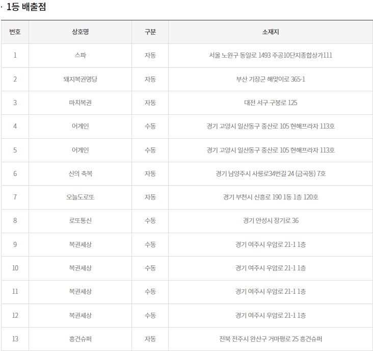 로또 1등 당첨자를 배출한 곳은 서울 노원구 동일로 '스파', 경기 고양시 일산동구 중산로 '어게인' 2명, 경기 남양주시 사릉로34번길 ‘신의 축복’, 경기 부천시 신흥로 ‘오늘도로또’, 경기 안성시 장기로 ‘로또통신’, 경기 여주시 우암로 ‘복권세상’ 4명, 부산 기장군 해맞이로 ‘돼지복권명당’, 대전 서구 구봉로 ‘마치복권’, 전북 전주시 완산구 거마평로 ‘흥건슈퍼’ 등 13곳이다.