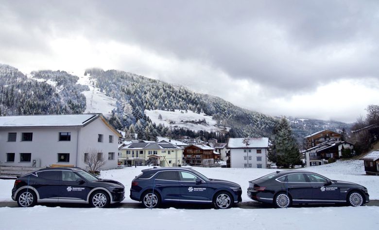 지난 2023년 다보스포럼에 행사차량으로 지원된 GV60(왼쪽부터), GV70 전동화, G80전동화 차량 [제네시스 제공] |