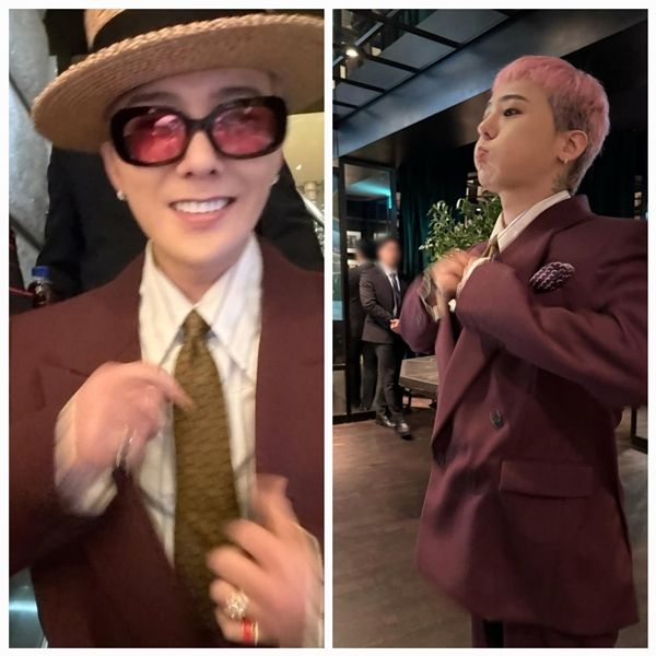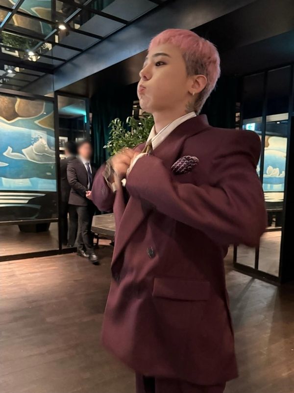 공개된 사진 속 그는 더블버튼의 와이드 버건디 수트에, 핑크 컬러의 투블럭 헤어, 그리고 은은한 포켓 스퀘어까지 더해 GD 특유의 ‘포멀을 위장한 자유’를 보여줬다.
