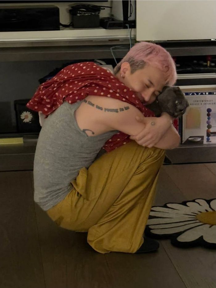두 번째 사진에서는 노란 팬츠에 민소매, 강아지를 껴안고 쪼그려 앉은 모습까지 공개했다. 카리스마 넘치는 행사장과는 전혀 다른 무드. ‘무대 위에서는 아이콘, 집에서는 소년’이라는 이중성은 여전히 유효했다.