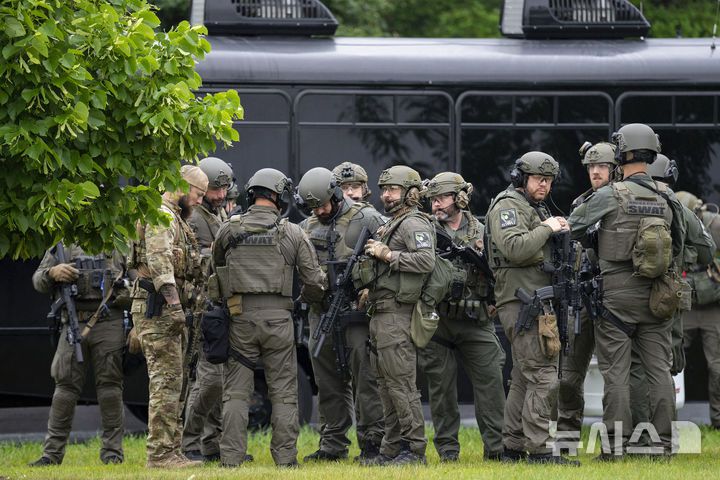 [브루클린파크(미 미네소타주)=AP/뉴시스] 14일 주의회 상하원 의원들에 대한 총격 사건이 발생한 미네소타주 브루클린파크에서 경찰 등이 출동해 있다. 2025.06.15.