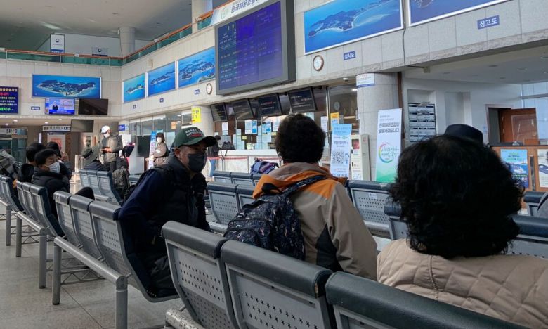 대천항 여객선터미널에서 섬주민들이 여객선 출항시간을 기다리고 있다. 송인걸 기자