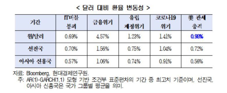 신지영 경제연구실 연구위원은 15일 ‘금융시장 안정, 환율 변동성 완화부터다’라는 제목의 보고서를 통해 “2025년 미국 관세 충격에 의한 원·달러 환율의 변동성(최고치 기준)은 0.98%로 나타났다”고 분석했다. 과거 위기 △IT버블 붕괴 0.69% △금융위기 4.57% △유럽 재정 위기 1.23% △코로나19 위기 1.41%와 비교하면 상대적으로 낮은 수준으로 판단했다.